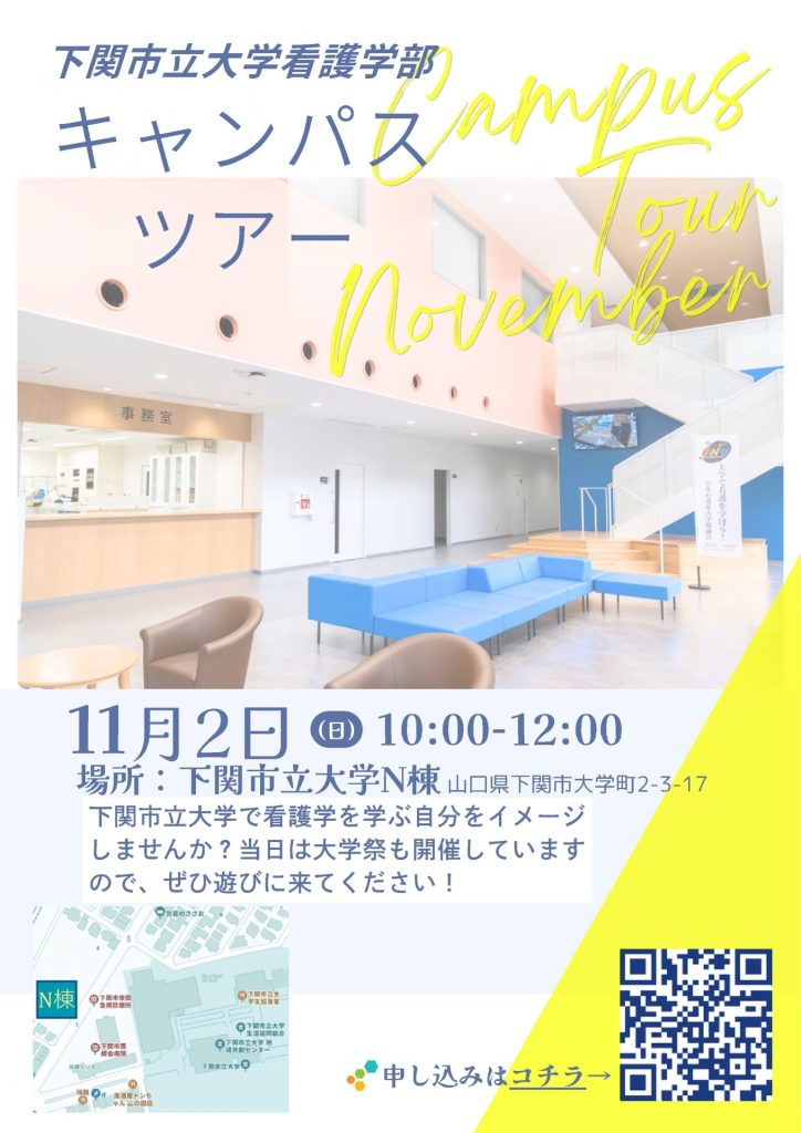 11월 2일(일)에 간호학부 캠퍼스 투어를 개최하므로 알려 드리겠습니다.당일은 대학 축제도 개최하고 있으므로, 꼭 방문해 주세요.
