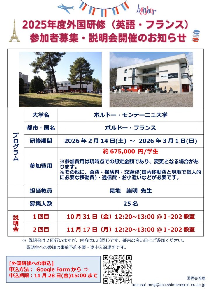 - 2025년도 외국 연수(영어・프랑스)참가자 모집!설명회 개최의 알림