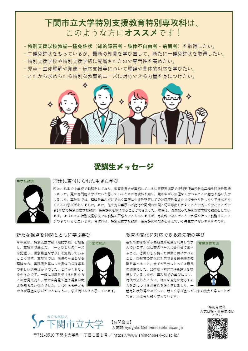 | 출원 요건 | 다음 (1)(2)에 해당하는 사람 또는 2026년 3월 31일까지 이것에 해당하는 전망의 사람으로 합니다. (1)다음 중 하나에 해당하는 자 학교교육법(1947년 법률 제26호) 제83조에 정하는 대학을 졸업한 자 이 학교교육법 제104조 제7항의 규정에 의하여 학사 학위를 수여받은 자 외국에서 학교교육에서 16년 과정을 수료한 자 문부과학대신이 지정한 자(1953년 문부성 고지 제5호) (2)초등학교, 중학교, 고등학교 또는 유치원 교사의 보통 면허장을 가지는 사람 본 전공과에서 특별지원학교 교사 일종 면허장을 취득하려면 학사 학위를 가지는 것 및 초등학교, 중학교, 고등학교 또는 유치원의 교사의 보통 면허장을 가지는 것이 기초 자격이 됩니다. 덧붙여 기초 자격에 대해서 불명한 점이 있는 경우는, 각자로, 본학 혹은 야마구치현 교육위원회의 담당 창구에 사전에 상담해 주세요. |